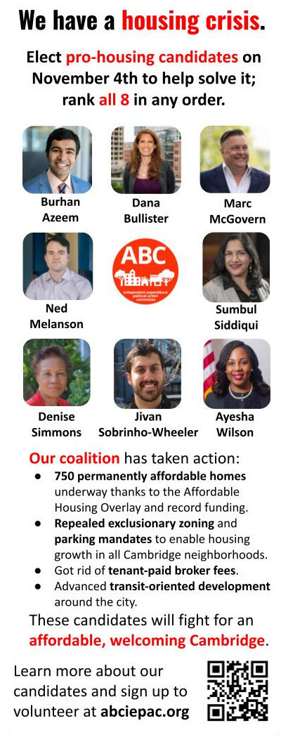 Mostly, knocking on doors and helping other people knock on doors. Our goal is to knock on 10,000 doors in this election (last time ABC IEPAC knocked on 7000). 23,500 people voted in the last election, so that would mean canvassing half of the voters in Cambridge!1 We are sharing information about eight candidates who will prioritize solving the housing crisis.